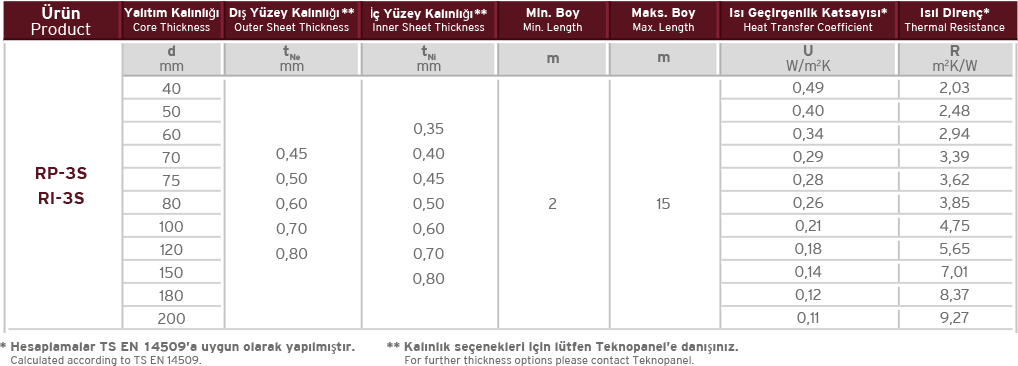 - TS EN 14509’a göre ısı geçirgenlik katsayısı U değeri, panel kalınlıklarına göre 0,49 – 0,11 W/m2K arası